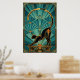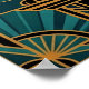 An elegant black cat silhouette stretches gracefully with a golden curved tail forming a perfect arc, framed by teal fan rays and architectural accents. This refined 1920s art deco composition captures poised sophistication, making it ideal for yoga studios, living rooms and modern spaces where cat lovers seek stylish, timeless decor.