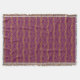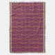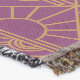 Kastfilten har en konsthantdesign av halvcirklar och linjer som ser ut som en soluppgång i guld på fält i äggplanta. Säg det.