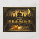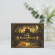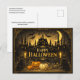 En slående halloweenillustration i Art Deco-stil återgiven i dramatisk svart och lysande guld. Ett storslaget, silhuetterat spökhus reser sig under en halvmåne medan fladdermöss sveper över strålande, solfjäderformade strålar. I förgrunden sitter tvilling svarta katter symmetriskt bredvid lysande ljus och en trio pumpor, inklusive en glad jack-o'-lantern, ramad av frodig höstvegetation. Eleganta geometriska ramar, metalliska accenter och djärv vintage-typografi ger designen överdådet hos en 1920-talsaffisch och blandar kuscharmer med Jazzålderns glamour.