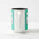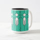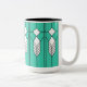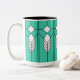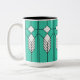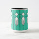 Mugg har en nedfläckad-glasfönsterdesign av konst-deco med diamanter och linjer i vitt, svart och turkos.