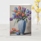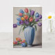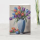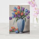 Rosa-, blått- och lila-tulpaner i och bredvid blå Art Deco vas