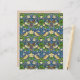 Pappra i ett mönster av stulna fåglar, blommor, jordgubbar och löv i mjuka skuggor av blått, grönt, beige och tan på en mörk med blåblå bakgrund