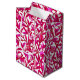 Gift-säck i mönstren William Morris Art nouveau på exotiska fåglar i ett träd, med fuchsisk rosa och violett löv, fåglar och frukt i fuchsia och orchid rosa på vit bakgrund.