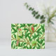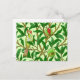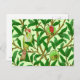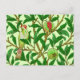 vykort i ett mönster i William Morris Art nouveau av exotiska fåglar i ett träd i granat, med emerald grönt löv, fåglar och frukt i kalkgrönt och djuprött ruinröd, och med pastellgrön bakgrund