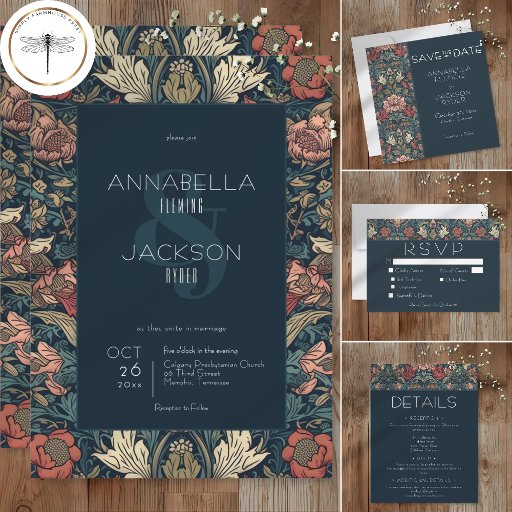 Indulge in the enchantment of the past with our vintage floral wedding save the date card. Inspired by the iconic patterns of William Morris, this design feature a mesmerizing blend of teal blues, pinks, creams, and green. The intricate floral patterns, reminiscent of the Art Nouveau era, this design adds vintage allure to your special day. The elegant vintage font on a dark blue background provides a striking contrast to the vibrant floral backdrop. This timeless design captures the essence of classic romance, making it the perfect choice for couples seeking a truly unique and unforgettable invitation. Created by Simply Farmhouse Press.