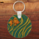 A decorative artwork depicts a stylized orange goldfish swimming through flowing, ribbon-like aquatic forms. The fish, positioned in the upper-left, features intricate, layered scales and delicate fins rendered in warm oranges and golds. Surrounding it are sweeping, golden-yellow lines that resemble underwater plants or currents, curling into elegant spirals at the bottom. The deep teal-green background contrasts richly with the luminous gold and orange elements, creating a sophisticated, Art Nouveau-inspired feel. The piece appears three-dimensional, reminiscent of paper quilling or relief art, with graceful movement and harmonious color balance.