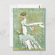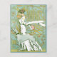 En kvinna som håller ett stort ro och hennes greyhound står framför en vägg där det står "blommor" i en illustration av vintage Art nouveau för en tidskrift från 1909.