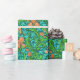 Förpackning papprare i ett textilmaterial av William Morris av järn och löv, digitalt utökat och färgad, i orange, kalkgrönt och mjukt akvarium, på djupa turkospisar