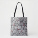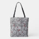 Totepåse i Art nouveau mönster av jordgubbsplantor, med löv, blommor och bär, baserad på en vintage William Morris-textildesign, digitalt förbättrad och färgad i svartvitt, med mörk-grått/grått-bakgrund och accent av djupa röda bär