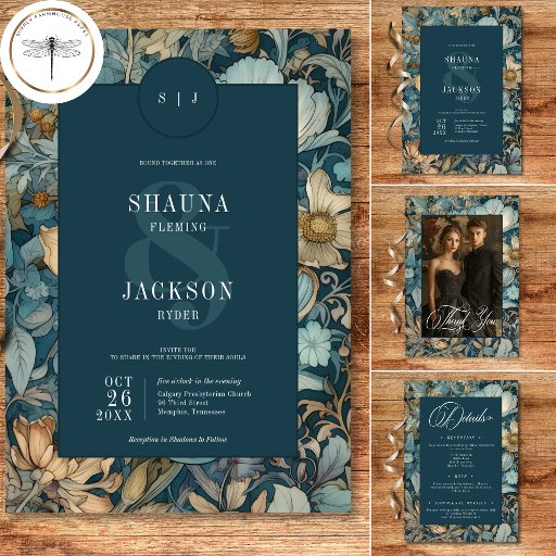 Indulge i det förgångna med våra kort från vintage blommigt bröllop spara datum. De här inbjudningarna är inspirerade av William Morris' ikondesign och innehåller en blandning av vintagar - djupa tealblåsor, mjuka tans, golder och krämer. De invecklade blommönstren, som påminner om Art nouveau-eran, lämnar en aning mörker och tillför en mystisk allyr till er speciella dag. Mörkens tealtextområde, med elegantens skript för vintage, ger en slående kontrast mot bakgrunden för rikens blommigt. Den tidlösa designen fångar det centrala i det klassiska romantik, skapar par perfekten att välja en verkligt unik och oförglömlig inbjudan. Skapat av Farmhouse Press.