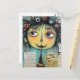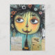 Digital skrapbokning och konstjournalinspiration. Bits och delar av pappert limmade på en blå tryckt bakgrund. Top lagrar: en viskig flicka med vild svart hår och stort ögon. — En vismisk kvinnlig karaktär med stort, uttrycksfullt ögon och en lekfull mängd skribblar och hårcirklar dominerar förgrunden. Bakgrundsversionen av inslag omfattar insamlade anteckningsbokssidor och abstrakt motiv som ger en fantasirik och storartad kvalitet.
