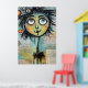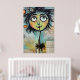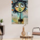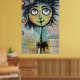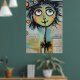 Ett viskartat tecken med stort, uttryckligt ögon och ett färgstarkt, luddigt hörlstycke dominerar förgrunden mot en kollage av skrivna texter och abstrakt inslag i bakgrunden. Visningarna i figur är en snabb charm med sina oproportionerliga egenskaper och skarpa accent färg.