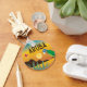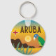 Aruba ljusa illustration med en bergig strand, sol, rena växter, en brun trogen parakit och de fyra spetsiga stjärnorna från Aruba. Namn finns i ett vintage deco-teckensnitt. Minnet av din semester- eller karibiska kryssning.