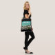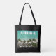Aruba Bech-scenen med handflatan träd, paraplyer och simmare i tropiska havet.