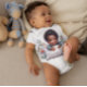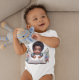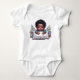 En bedårande afroamerikansk baby pojke som bär en baby bodysuit med en bild av en akryl målning av en liten pojke med sina dyrbara händer liggandes på sin kudde.