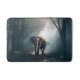 Ett badmatt med ett foto av en asiatisk elefant med rundat öron i en skogsskena tittar mot tittaren med solsken strömmande ner genom träd kanopi.