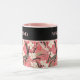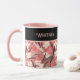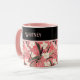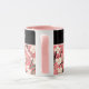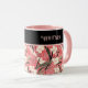 This lovely Asian-inspired monogrammed mug features a Japanese style floral print of dusty pink, light peach, garnet red, creamy white, and brown. Your monogram name appears in a stylish typeface in pink against a color block of black at the top on both sides of the cup. This mug has a pink handle and interior.