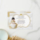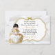 Vackert flicka i vit och guld klänning. Inbjudan har sin bakgrund i vit satäng med guld och silver glitter ram och förskönande av buken. Baksidan är försedd med guld-blomman mönster & guld på en vit satinbakgrund.