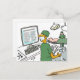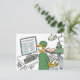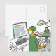 Roligt medicinskt seriebildskort. En asiatisk kirurg ska precis utföra en operation på en operationssal och kontrollerar instruktionerna online via en datorskärm. Medicinsk humor.