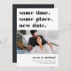 Behöver du skjuta upp eller boka om ditt bröllop? Låt gästerna veta med dessa moderna och lättsamma kort i vitt med rik off-black bokstavering. Rolig och smart typografi-baserad design har "samma tid, samma plats, nytt datum" högst upp med ditt nya bröllopsdatum och detaljer nedan. Anpassa med ett foto och lägg till ytterligare information på baksidan.