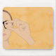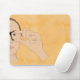 Musknappen är tryckt med en handritad utformning som visar att en kvinna undertecknar ASL-skylten för GLASSES mot bakgrund av orangen.