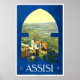 Snygg vintage resor poster reklam för staden Assisi i Italien. Det visar en underbar landskapsvy genom ett kyrkfönster.