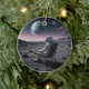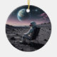 En astronaut i rymdsuit sitta i en gräsmatta stol vid måne.