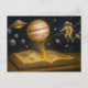 En astronaut stiger upp från en öppen bok ut i det yttre rymden, omgiven av planeter, stjärnor och lysande galaxer. Fantasy- och science fiction-illustration med futuristisk atmosfär och fantasifull stil.
