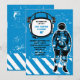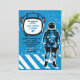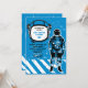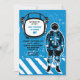 En realistisk, grungeinbjudan som presenterar en astronaut och en hjälm "ram" för att betona ditt barns namn och ålder. Kortet är lätt att skräddarsy med ditt uttrycka, stilsort, stilsortsfärg och primat av sex pappra typer.