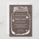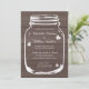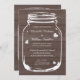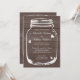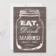 Ät, drick och gift dig murarljusglas bröllopsinbjudningar. Bruna och vita country-chic glas mason-jär bröllopsinbjudningar. Rustik design med trästrukturpanel med vintage vittrade hjärtan / kärlekssymboler. Elegant script-typografi för brudens och brudgummens namn plus datum. Söta bröllopsset för sommarens utomhus trädgårdsladugård bröllop / grillfest i juni, juli, augusti, september etc. Anpassningsbar text och lyxig papperkvalitet. Trendig DIY-tema. Anpassningsbar bakgrundsfärg. Snygga urblekta grunge-stil grafik och citat / texter.