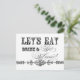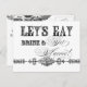 Elegant och roligt typsnitt säger: "Låt oss äta, drick och gifta dig!" på ett beundransvärt visitkort från Inbjudningskort för möhippan. I en ren, skarp, svart och vit palett i färg är det den bästa av vintagar med en modern vrid. Lägg lätt till Inbjudningskort för möhippan på baksidan.