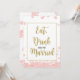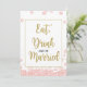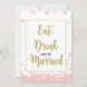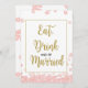 Denna moderna blomstergrafiska "Ät, drick och var gift" bröllopsduschskylt har en rosa blommig bakgrund med gyllene glitterstänk. Texten är skriven i en blandning av ett lekfullt kalligrafiskt teckensnitt och ett modernt sans-serif-teckensnitt.