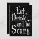 Var rädd för toppen med roligten som säger att festinbjudan är. Svart bakgrund med vit, kryptisk, grå vintage stil-text i ett gult teckensnitt med vitt spindelnät och spindelkryp. Ät, drick, var läskigt och ha roligt! Design Copyright © AnpassadBjuderOnline.