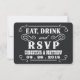 Ät, drick och var gift -- Vintage rustic country western bröllopsinbjudan Svarskort med rundade hörn valfritt. -- Virvlande virkar, rullar och gammaldags västern-typografi i vit text på svart färgad burlapbakgrund. Lägg till brudens och brudgummens namn och bröllopsinformation i denna lättanvända mall. Elegant och romantisk, retro-typografi kan lätt ändras för dina formella eller semi-formella bröllopsteman. avslappnad men klassisk modern country-stil är perfekt för trendiga rustika bröllop med en rolig touch av sofistikerad sydvästlig charm för traditionella par. Vänligen kontakta oss för hjälp med anpassning om du behöver ytterligare utrymme för dina bröllopsdetaljer. Andra storlekar och krittavla-stilar tillgängliga, tillsammans med matchande porto, bröllopstillbehör, showerpresenter och bröllopspaket essentials för DIY-brudar på en