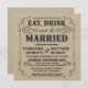 Ät, drick och var gift -- Vintage country western bröllopsinbjudningar -- Virvlande, lockiga rullar och gammaldags rustic typografi på blekt beige burlap bakgrund. Lägg till brud och brudgum namn och bröllopsinformation i denna lättanvända mall. Elegant, rolig och nyckfull, retro-krita stil kalligrafi kan modifieras för ditt formella eller semi-formella bröllopstema. Ledig men klassisk modern stil är perfekt för trendiga samtida bröllop med en romantisk touch av sofistikerad sydstats charm för traditionella par. Vänligen kontakta oss för hjälp med anpassning om du behöver ytterligare utrymme för dina bröllopsdetaljer. OBS: Visas på fyrkantiga 5,25 x 5,25 inbjudningskort. Andra storlekar och stilar finns tillgängliga, tillsammans med matchande frimärken, koordinerande bröllopspapper, bröll