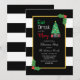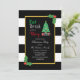 Ät, drick och vara god jul julfest inbjudan med ett Julgran och gåvor mot ett guld ram. Svart och vit strimlad bakgrund med grå