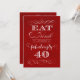 Den eleganta anpassadeinbjudan med ord äter, drinken och är fabulously 40 för en fyrtionde födelsedagsfest. Elegant röd texturerad bakgrund.