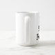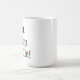 Vitmuggen med svart text och en röd utrop pekar