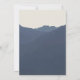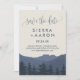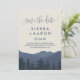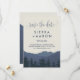 Denna reträtt till bergen, spara datumkortet är perfekt för ett modernt bröllop. Utformningen har ett bergsområde med en blå serenblått vattenfärg med en skog av evergreen träd i förgrunden.