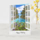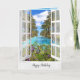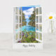 Öppna fönster och ren gardinvy över bassäng och handflatan träd i Bahamas på födelsedagen.