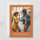 Det här moderna kortet för retroaktiv bröllop spara datum har svartvit text i en bränd orange bakgrund. Lägg till namn och monogram initialer för briden och trimningen i snyggtens återbildningstypografi för visning och detaljerna i sans serif-teckensnitt. På motsatt sida byter du ut exempelbilden mot ett eget favoritfoto och lägger till en kort text med namn, datum och bröllop webbplats-URL, om du vill.