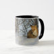 Underbart nära med vinterscenen i snö täckte backe och vilande räv inramad med träd.