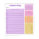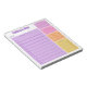 Praktiskt anteckningsblock för att hjälpa dig att behålla reda på dina dagliga vanor, skapar dig dricka tillräckligt med vatten, sträcka dig minst gång varje timme under en åttatimmars arbetsdag, ta det antal steg du behöver och kom ihåg att ta dina läkemedel eller vitaminer! Det finns också en praktisk lista med tio kryssrutor så att du kan göra din dagliga lista med att göra det och checka ut varje uppgift som du har avslutat. Längst upp lägger du till ditt namn i ett fet lila-teckensnitt. Dagsspåraren för vanor trycks i färg i block av rosa, lila, orange och gult.