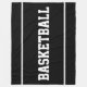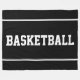This sporty design features athletic white BASKETBALL text centered on deep black background with sleek white edge stripes.
