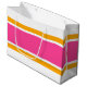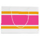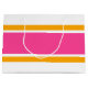 Den här roligtens färgstarka design har ränder med gyllene gulter som framhäver ett stort, ljust kandy rosa center rand mot en vit bakgrund.
