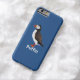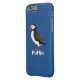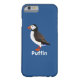 En digital målning av en Atlantic Puffin. Text som läser "Puffin" visas också. Atlantic Puffin (Fratercula arctica) matar främst genom dykning i vatten. De föds upp i stora kolonier på kustklippor eller öar till havs i Nordatlanten. De släppte de färglösa yttre delarna av sina räkningar efter fortplantningssäsongen och lämnade en mindre och mindre läderslag. Deras kort vingar är anpassade för simning med en flygteknik under vatten. I luft slog de snabbt sitt vingar (upp till 400 gånger i minuten) under snabb flygning, och de flyger ofta lågt över havets yta.