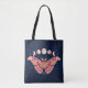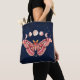 A celestial pink Atlas moth spreads its wings beneath a glowing sequence of lunar phases, set against a midnight sky scattered with shimmering stars. The balance of nature and cosmos creates a design that feels both grounded and otherworldly — perfect for anyone drawn to night skies, mystical beauty and boho vibes, this unique tote bag will add good energy to everyday outfits.