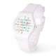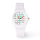 Denna klocka har i mitten av århundradet en modern utformning av ett rutnät i svart linjer med orange- och tårcirklar och diamanter.
