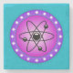 Vetenskapens temabild. En cirkelformad bild med symbolen för atomen inuti. En rosa bakgrund står i skarp kontrast till den svarta symbolen. Ett lila gräns med vita stjärnor runt bilden. En bild av coolan för gäk och vetenskapshögar.