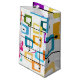 Den här presentsäcken har en design av rektanglar som är utsträckta på ena änden i groovy färg, orange, grönt, teal, lila, blått, rosa och gult med atomisk linjer som sprider dem.
